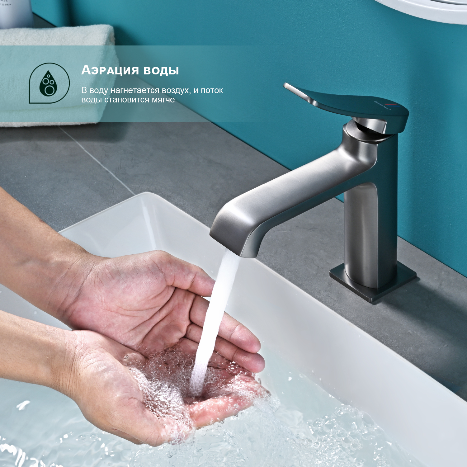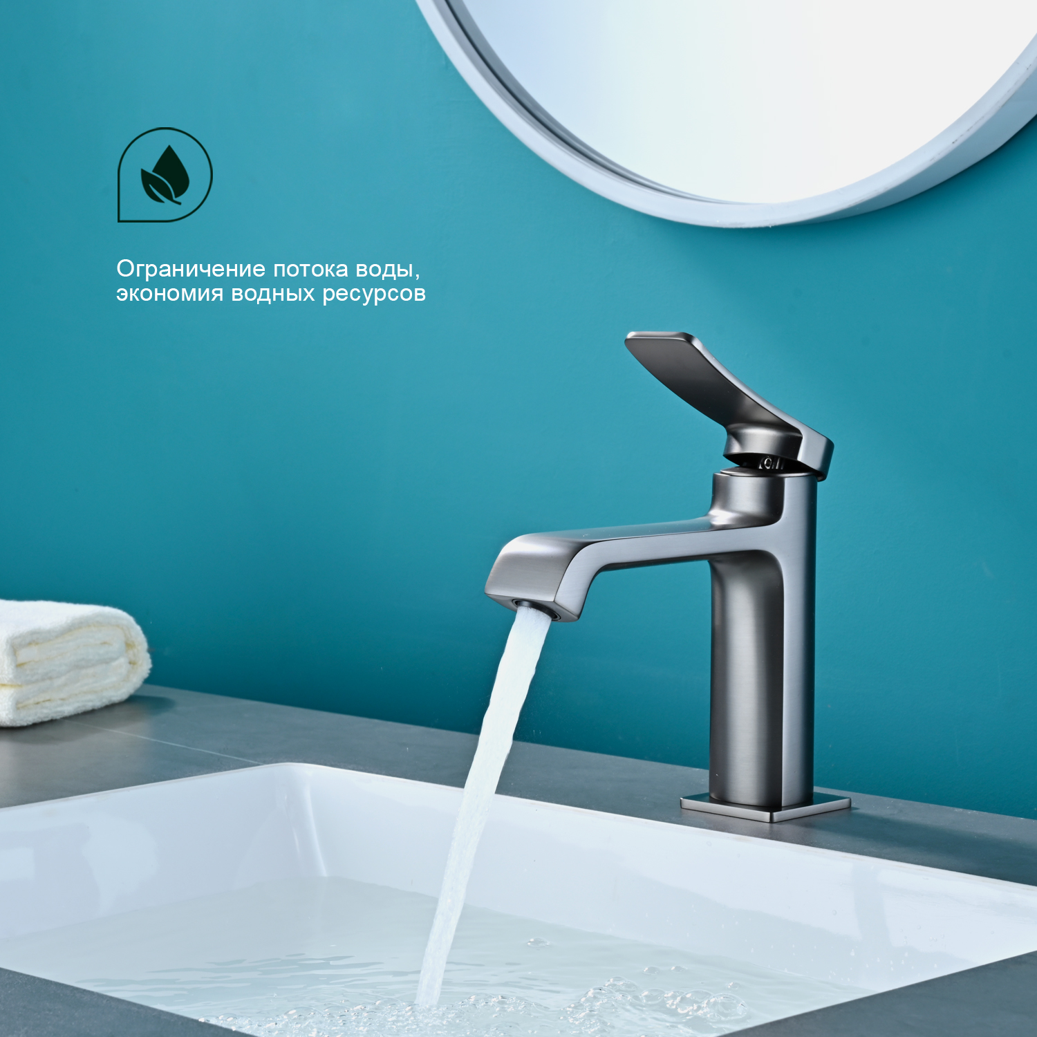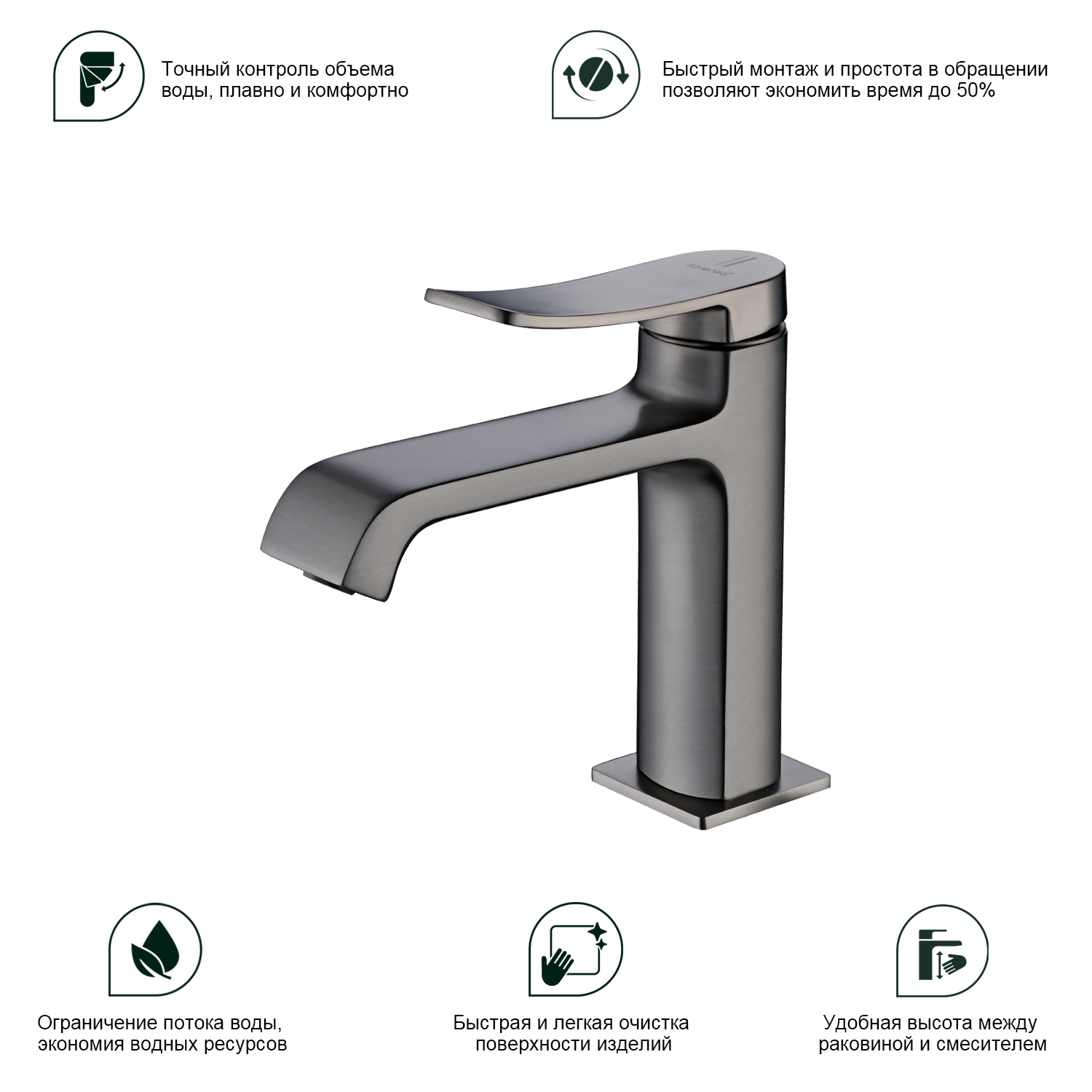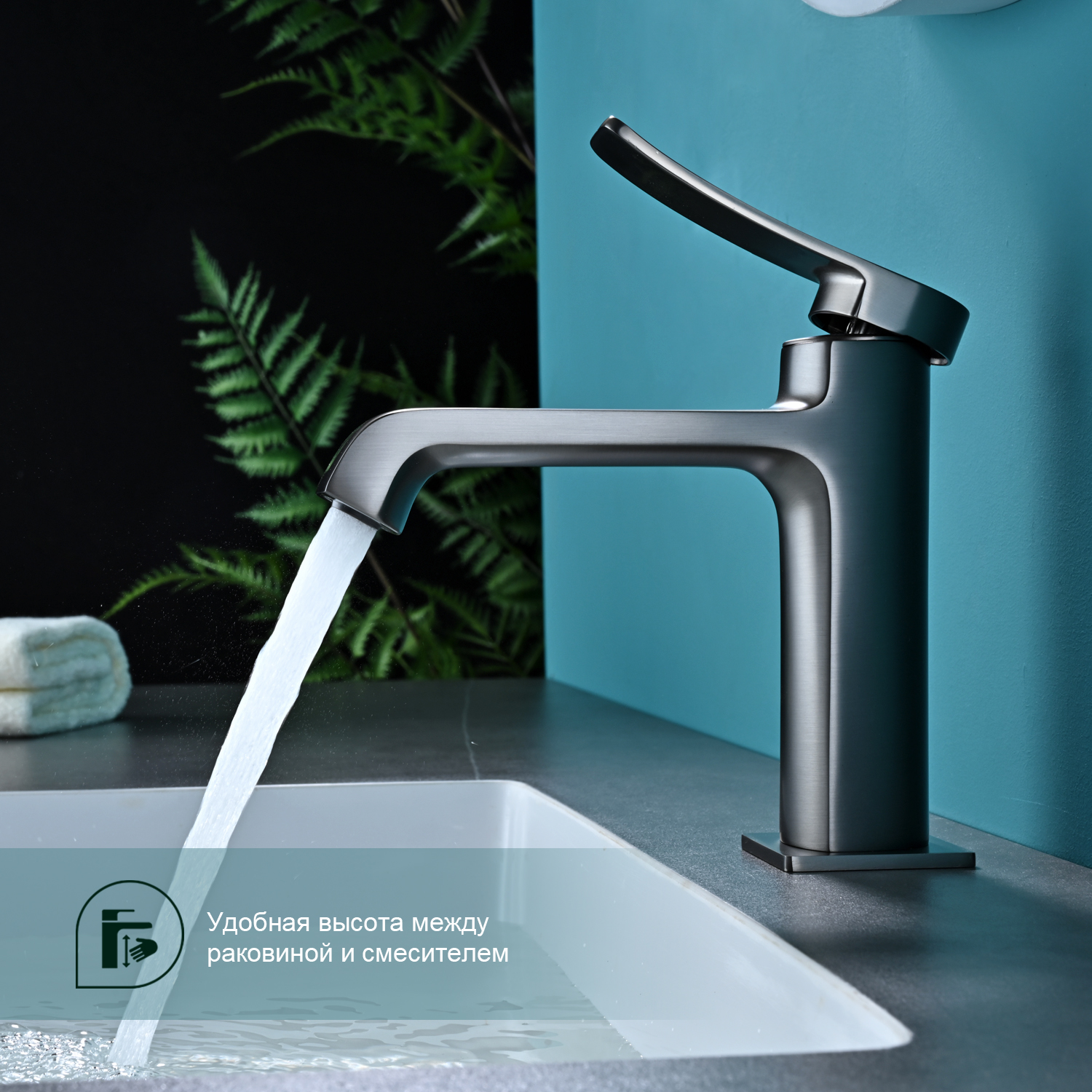 Основные характеристики: • Стиль: современный • Цвет: Графит • Материал корпуса: латунь • Форма: квадратная • Монтаж: На раковину • Кол-во отверстий для монтажа: 1 • Тип управления: одноручковый • Излив: монолитный • Стандарт подводки: 1/2"