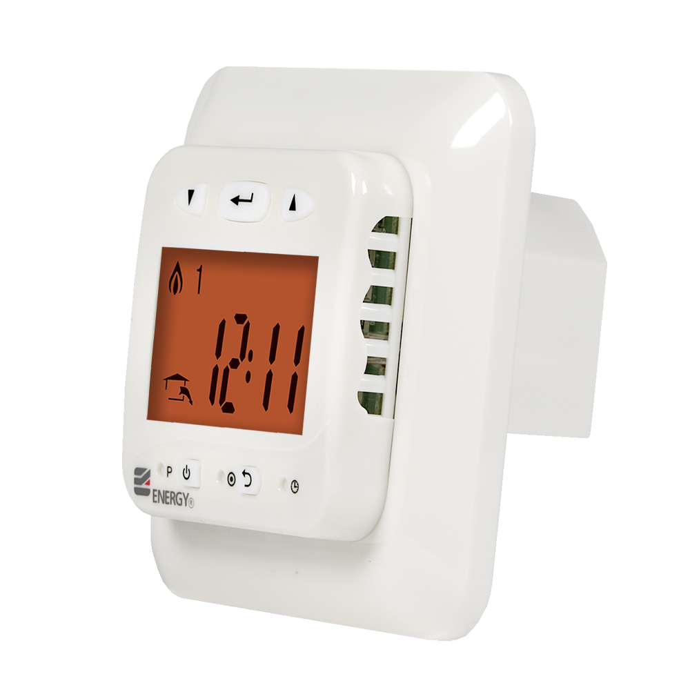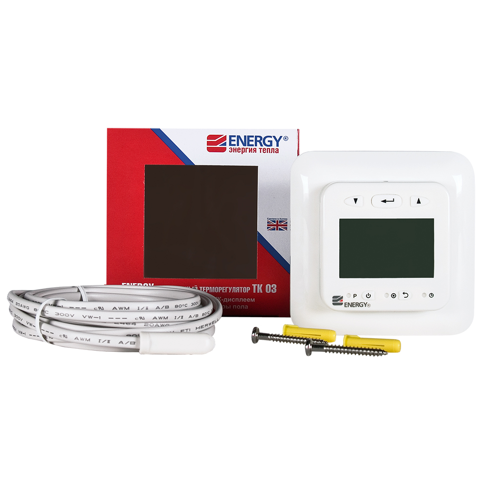 Электронный программируемый терморегулятор Energy TK03 с выносным датчиком температуры пола. Предназначен для скрытого утопленного монтажа с использованием стандартной монтажной коробки.