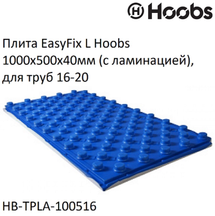 - ₽Плита для тёплого пола Hoobs EasyFix L HB-TPLA-100516 с ламинацией используется для укладки водяного отопления в полу с тепло- и звукоизоляционным нижним слоем из пенополистирола (или без него) и прочным плёночным покрытием, которое обеспечивает прочность бобышек и гидроизоляции.