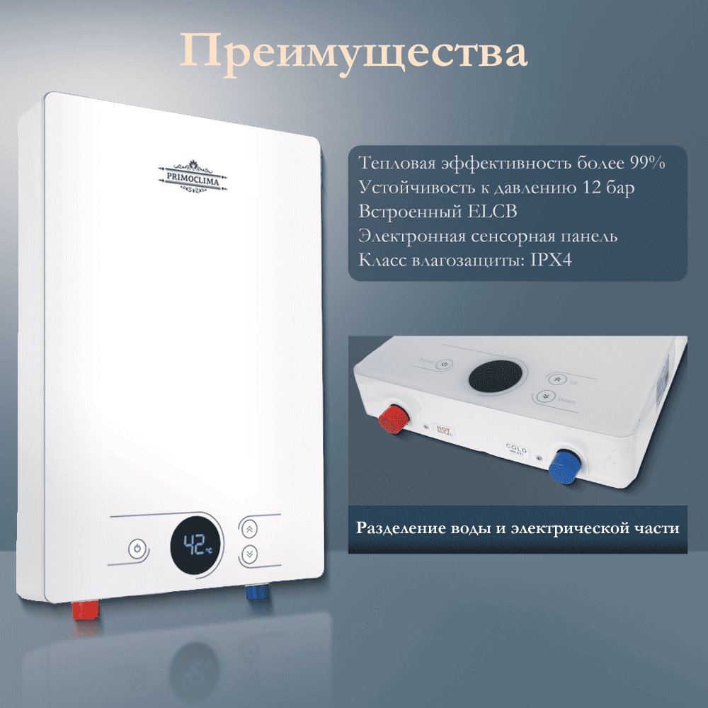 Преимущества отсутствие образования известкового налета разделение воды и электрической части улучшенный пользовательский интерфейс технологии преобразования энергии тепловая эффективность более 99% устойчивость к давлению 12 бар электронная сенсорная панель горячая вода за 2 секунды встроенный ELCB