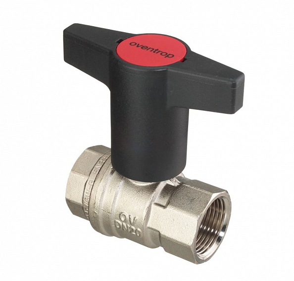 Полнопроходной шаровой кран Oventrop Optibal 1077106 3/4" ВР/ВР с внутренней резьбой оснащён высокой Т-ручкой из пластмассы цвета «антрацит» с вмонтированной в неё красной крышкой с надписью "Oventrop". Выполняет запорно-регулирующую функцию в системах водоснабжения, отопления и охлаждения. Размер резьбового присоединения составляет 3/4", условный диаметр трубы - 20 мм. Термин "полнопроходной" оправдывает себя: пропускная способность шарового крана 3/4" - 43 м3/час!