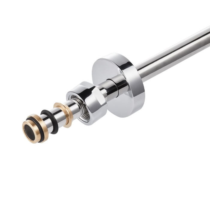 В комплектеКлапан термостатический осевой М30х1,5 и клапан запорный угловой, 2 латунных хромированных отражателя (Двн=15 мм), 2 хромированных латунных гайки